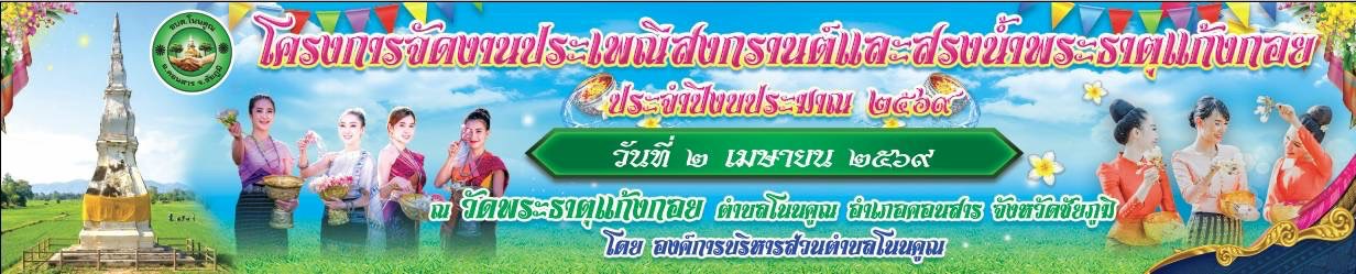 วันที่ 2 เมษายน 2569 องค์การบริหารส่วนตำบลโนนคูณ ได้จัดทำโครงการงานประเพณีสงกรานต์และสรงน้ำพระธาตูแก้งกอย ประจำปีงบประมาณ 2569 ณ วัดพระธาตุแก้งกอย